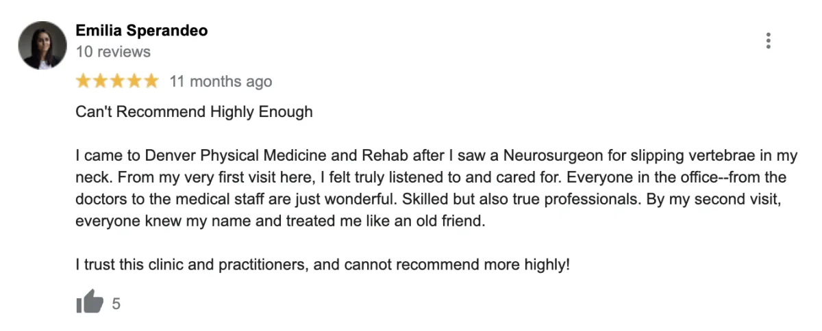 Disclaimer: Procedures and treatments performed by Denver Physical Medicine & Rehab have an inherent success (and failure) rate. Reviews, testimonials and content on this site should not be interpreted as a statement of efficacy of procedures and treatments performed by Denver Physical Medicine & Rehab for anyone else.